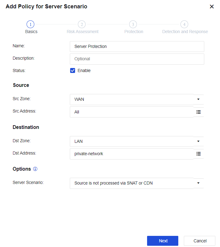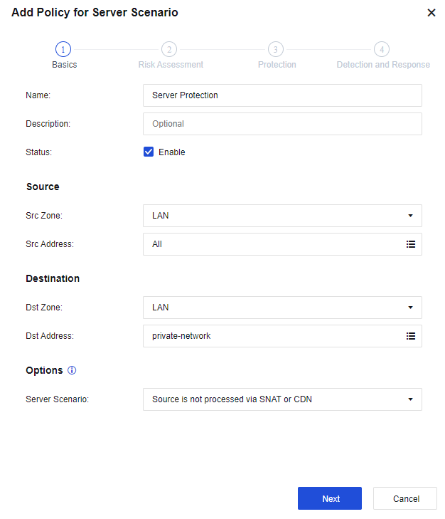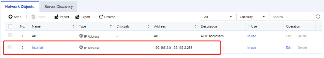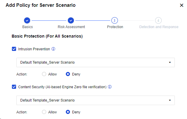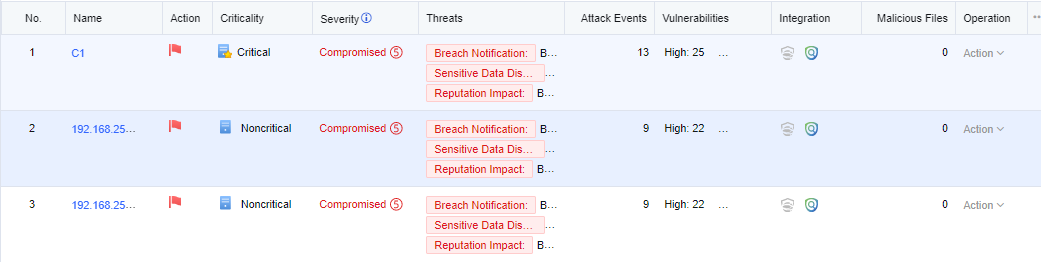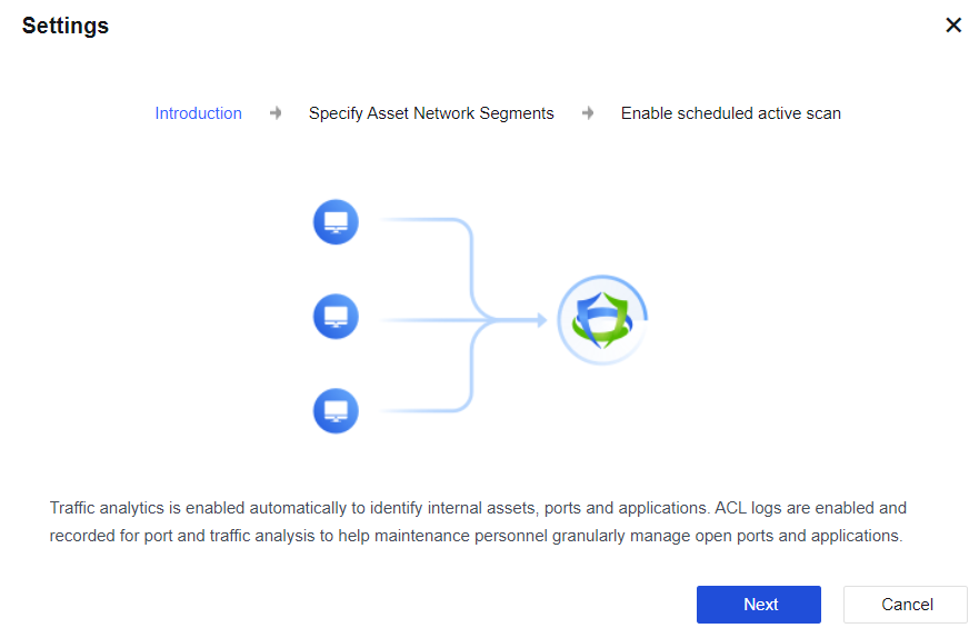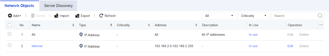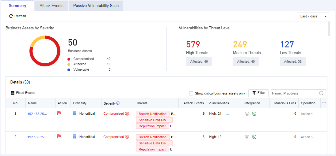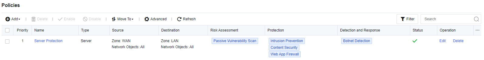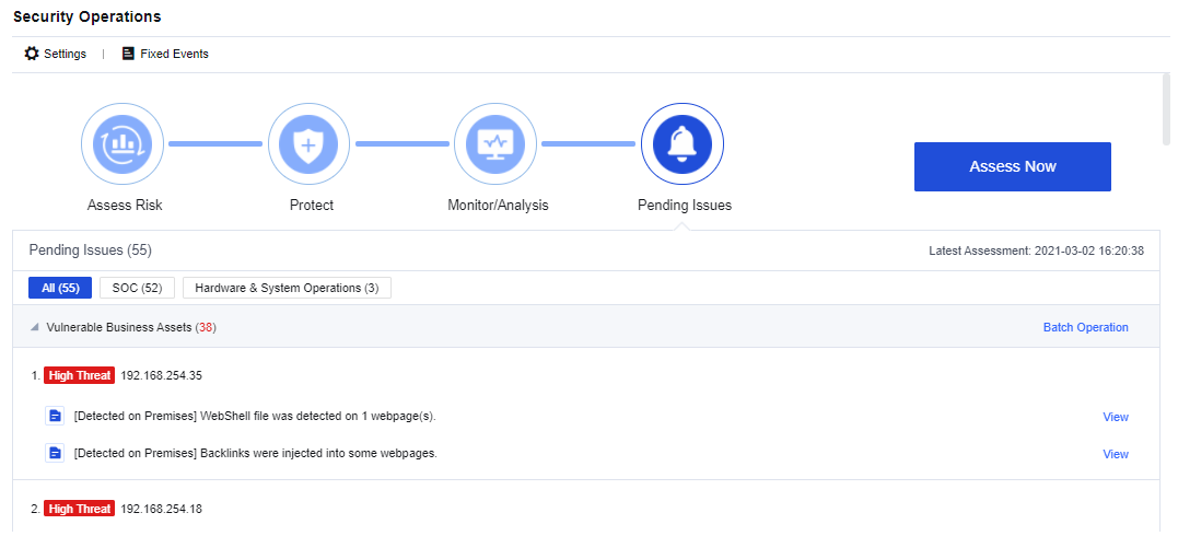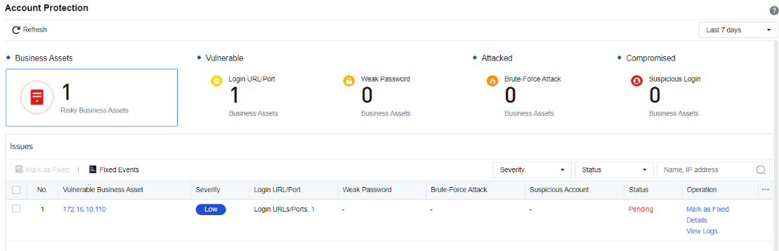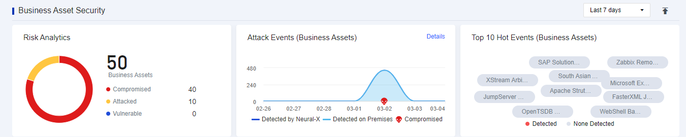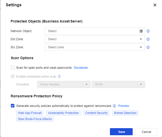 Network Secure can automatically identify risks such as open ports, vulnerabilities, and weak passwords on internal servers in advance and judge whether the identified assets have corresponding security protection policies and are in effect.