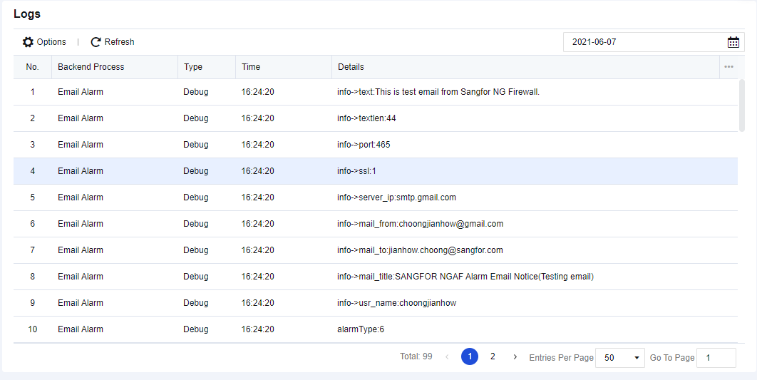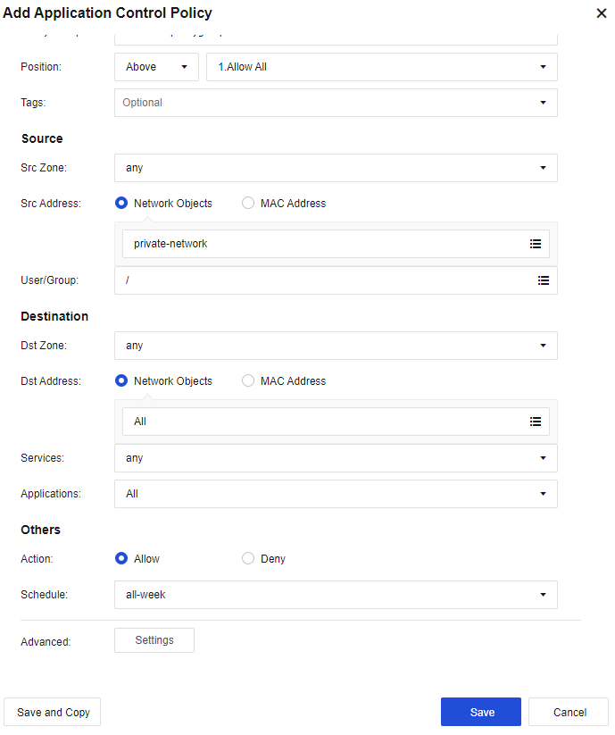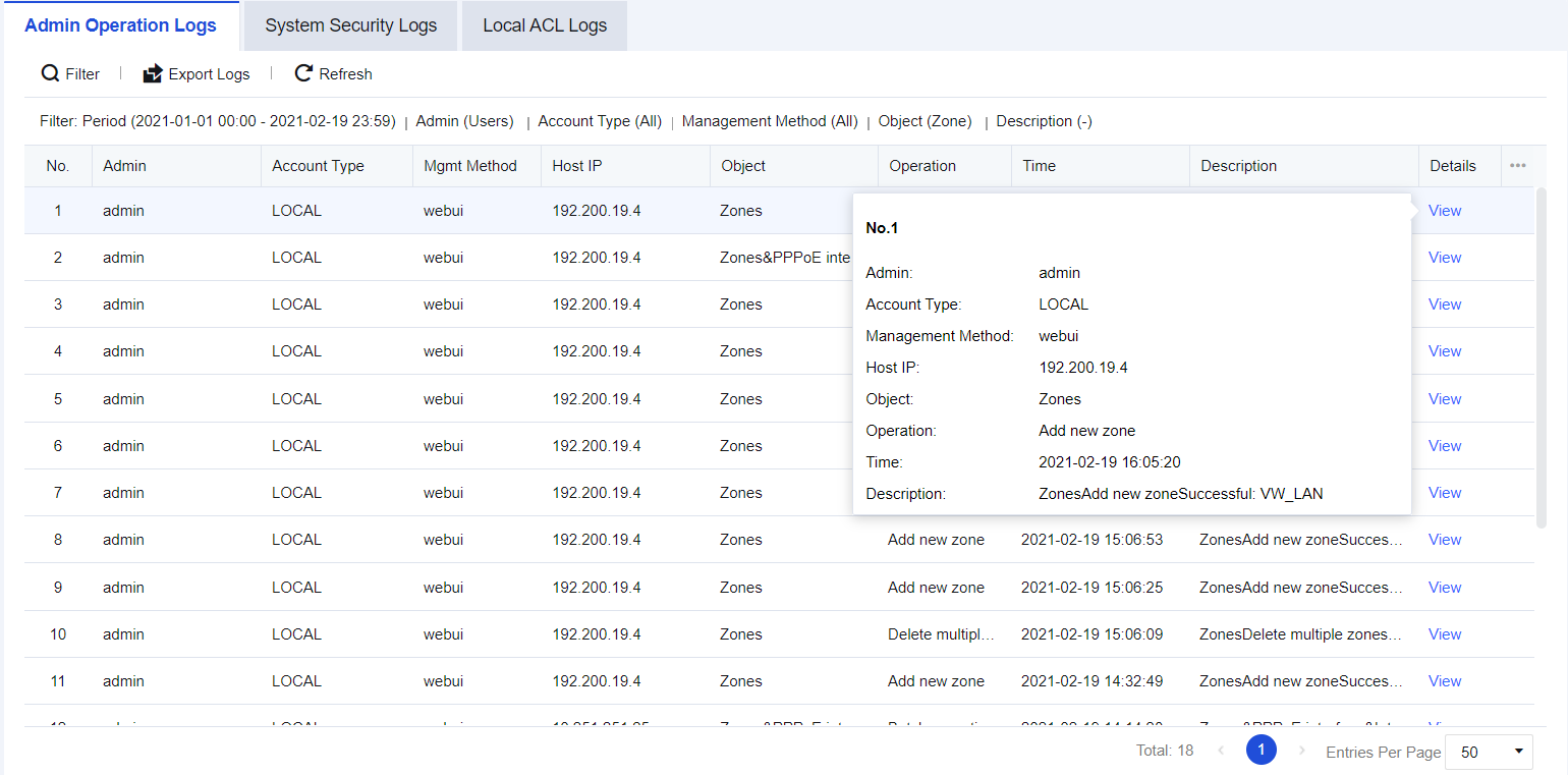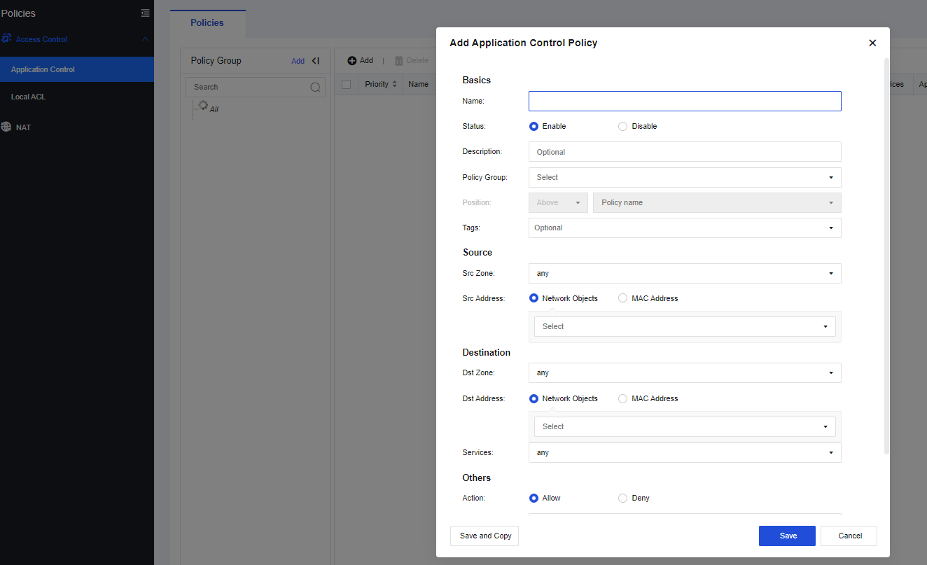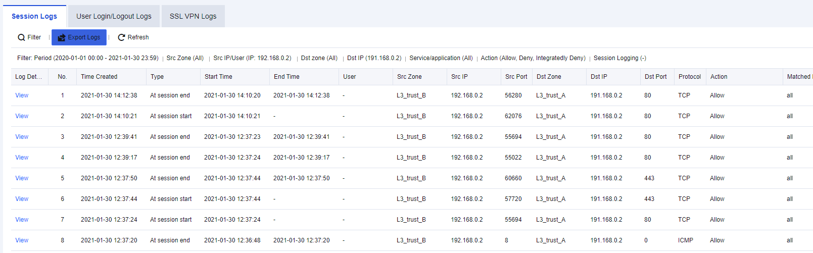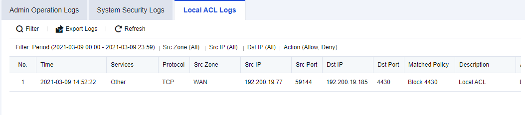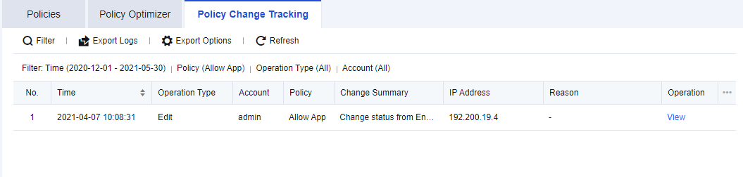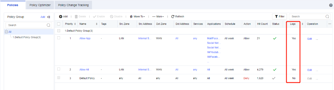 The logs of the application control policy are shown as the following figure, in which the Yes in the Logs column means to record logs: