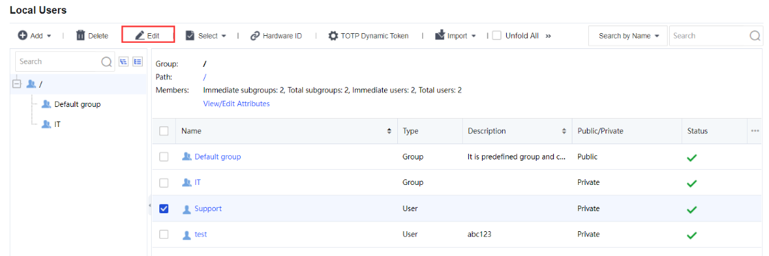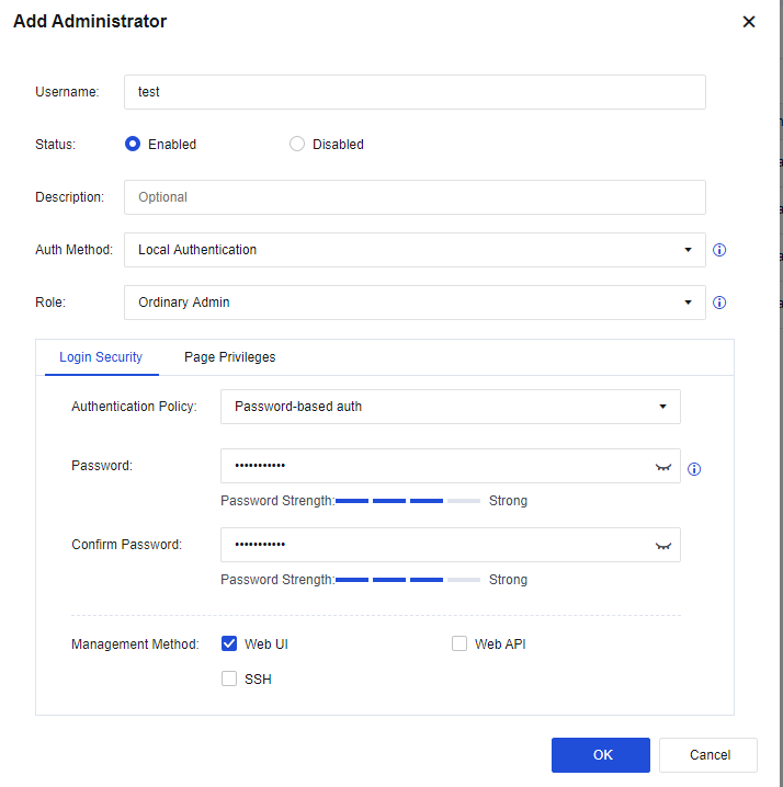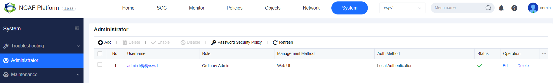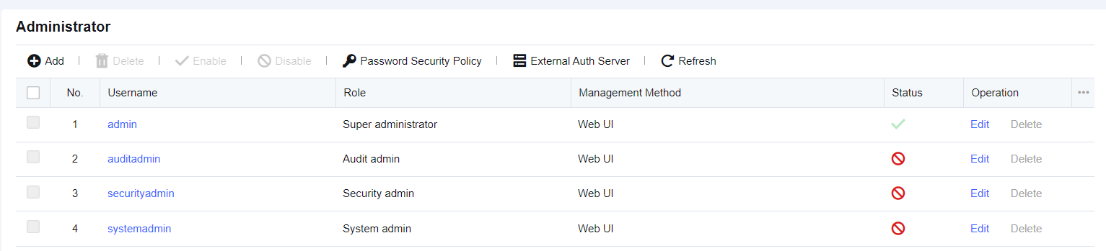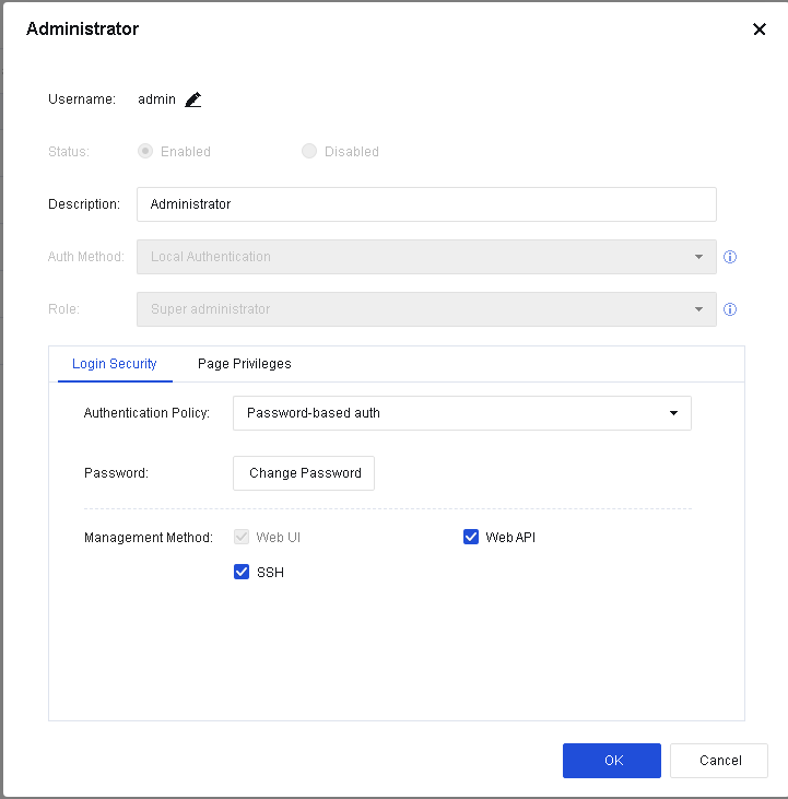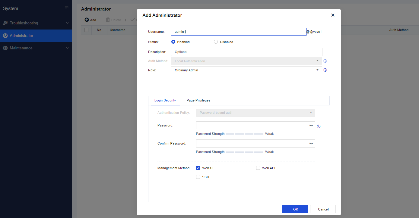 - Log in to the Web UI and go to System > Administrator. On the Administrator page, select an account and check SSH option in Management Method.