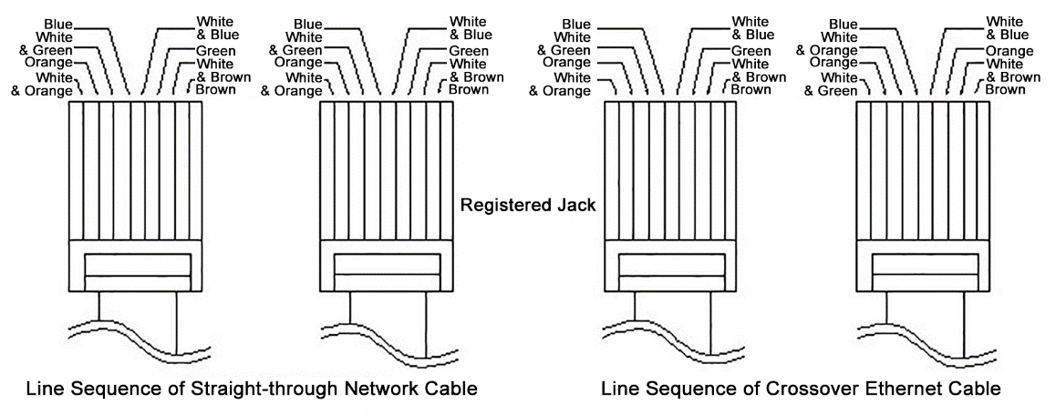 Use a straight-through network cable to connect the WAN interface to the MODEM and a crossover Ethernet cable to connect to the router. Use a straight-through network cable to connect the LAN interface to the switch and a crossover Ethernet cable to connect to the networking interface of the computer. When the indicator light is in normal status and the connection fails, please check whether the cables are connected correctly. The difference between the straight-through network cables and the crossover Ethernet cables lies in the wire sequence at both ends of the cables as follows.