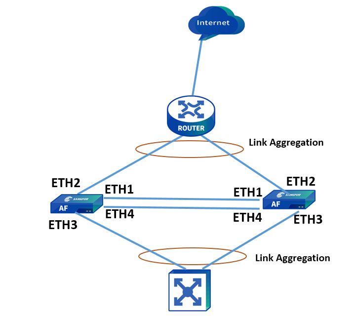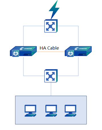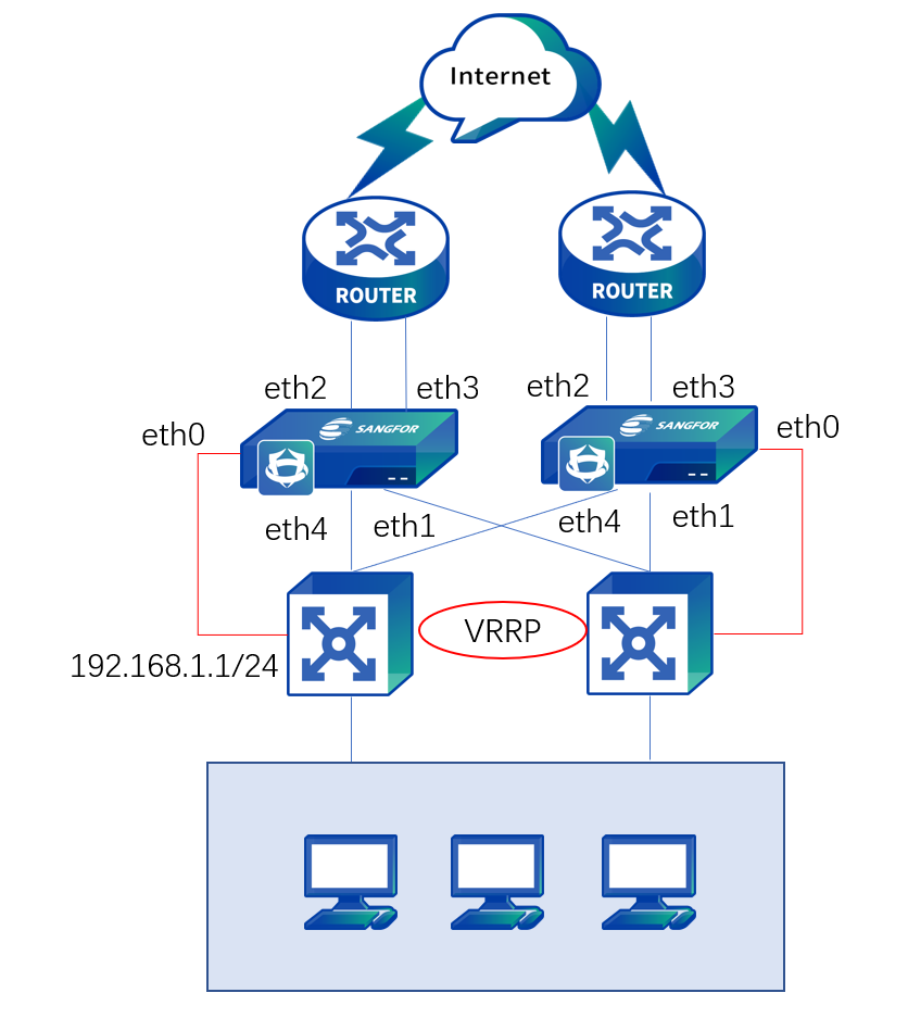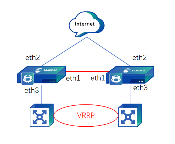 - Use a standard RJ-45 Ethernet cable to connect the ETH0 (LAN) ports of the two Network Secure devices to the same switch, and then use a standard RJ-45 Ethernet cable to connect to the LAN switch and connect to the internal LAN.