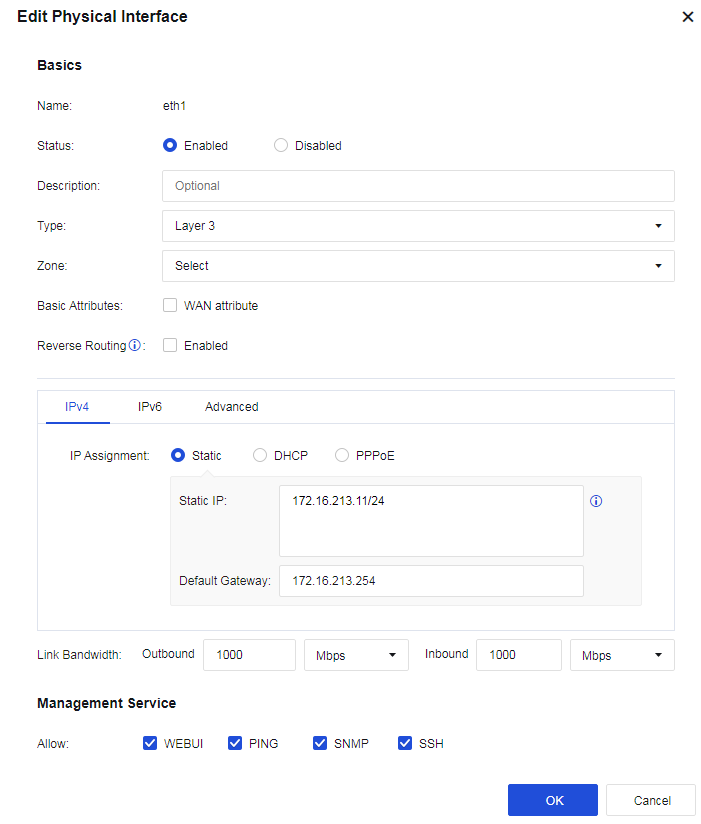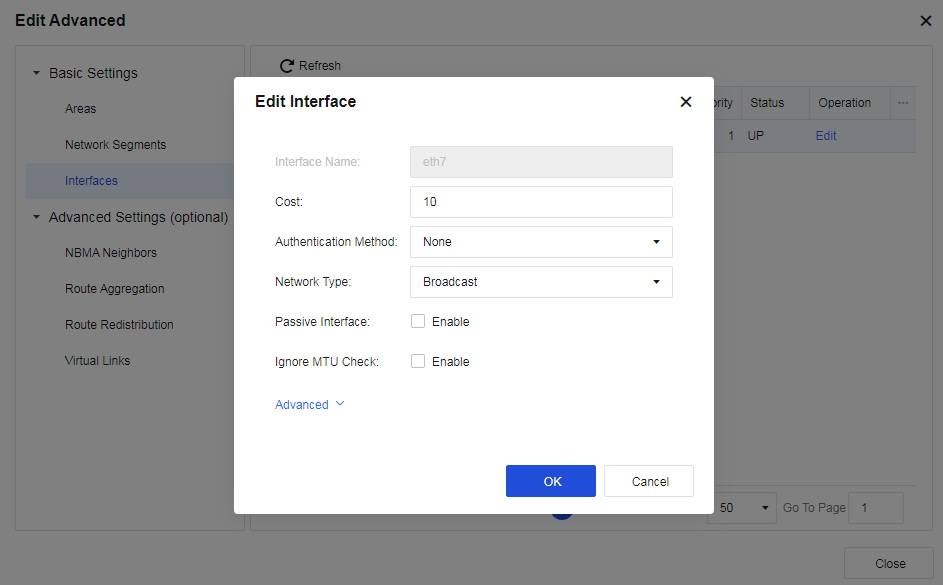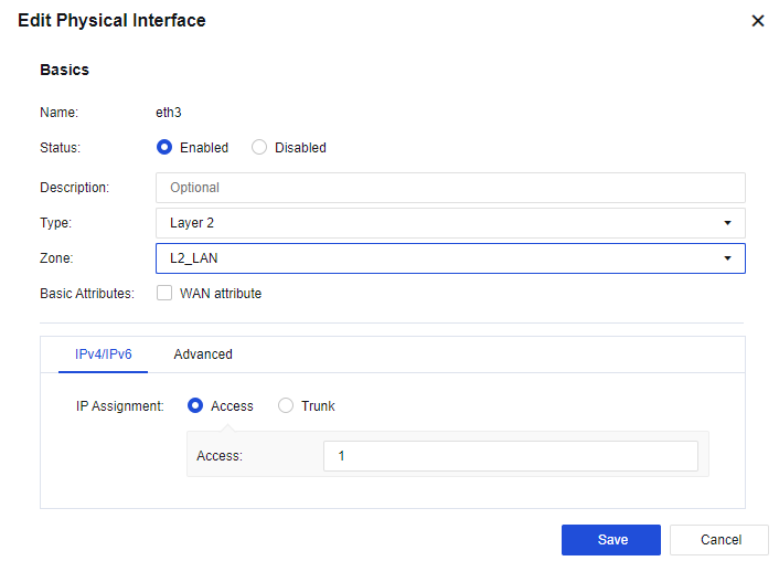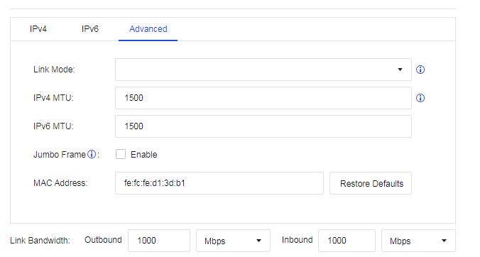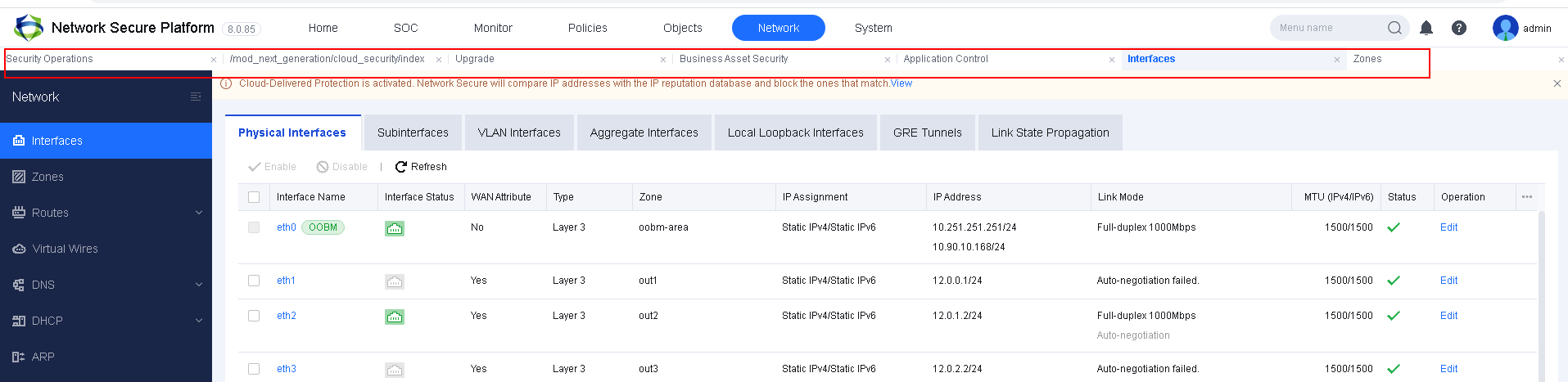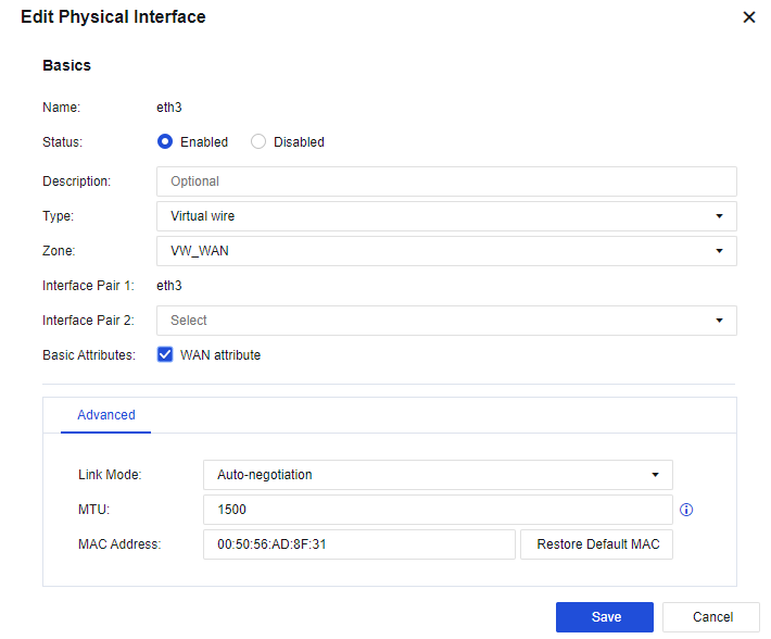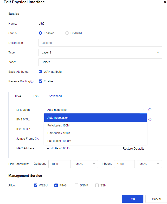 Go to Network > Interfaces > Physical Interfaces and click the interface you want to edit. Click Advanced and select different rates and duplex modes to check whether the interface can work normally.