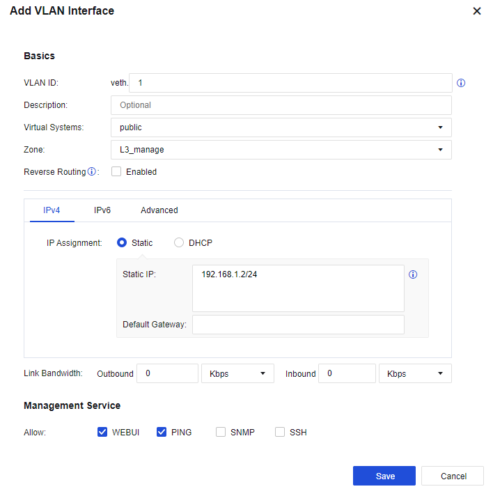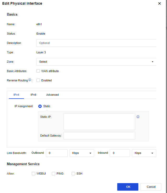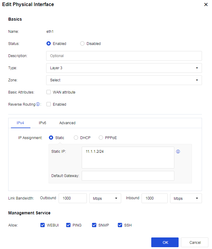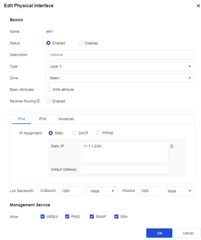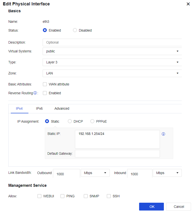 - Go to Network > Interfaces. Select a network interface and enable SSH in Management Service.