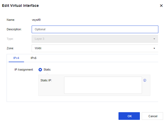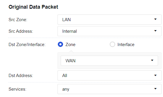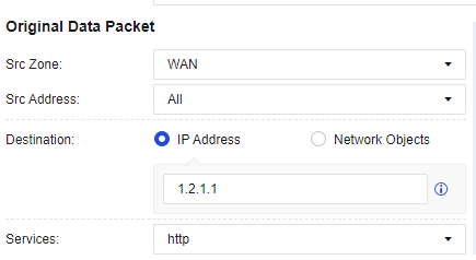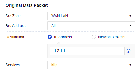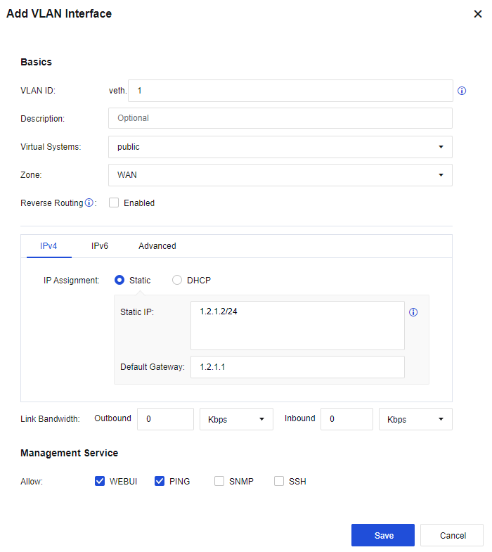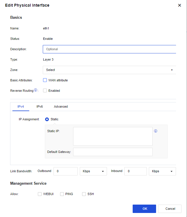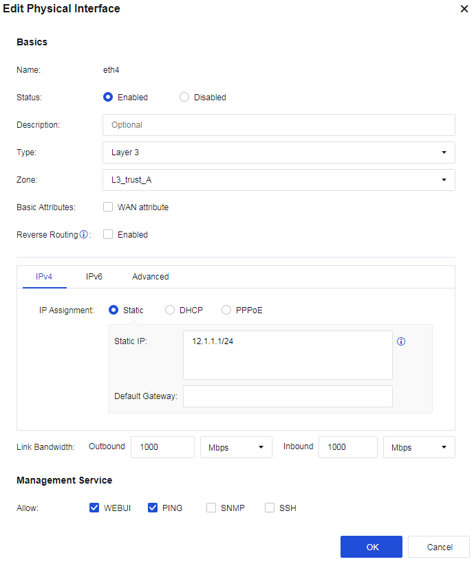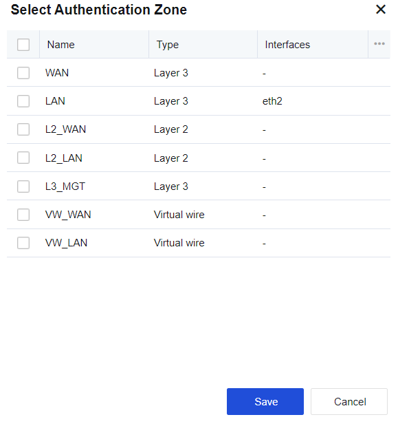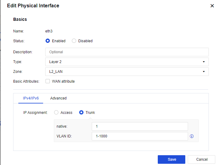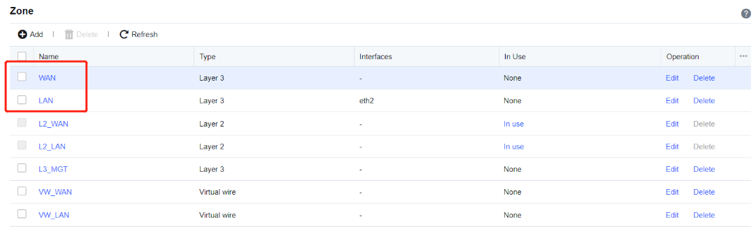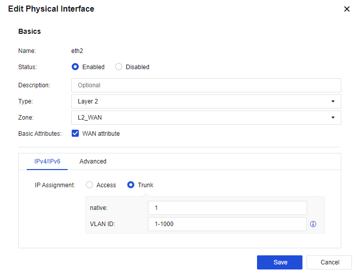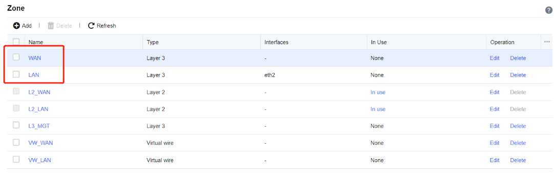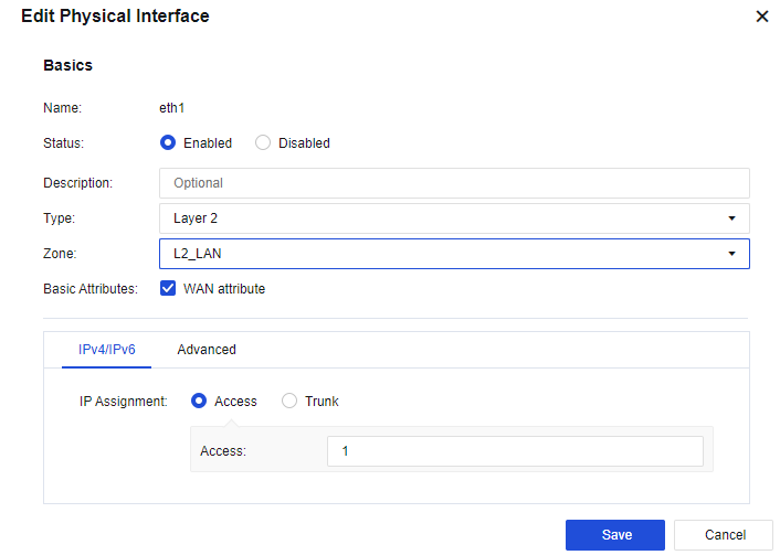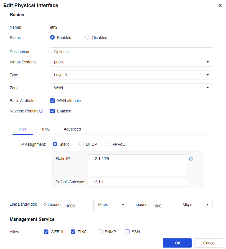 Configure the WAN interface: Click the interface to be set as the WAN interface through Network > Interfaces > Zone. Select eth2 as the WAN interface, select Layer 3 for Type and the WAN for Zone, check the WAN attribute checkbox, and configure an IP address 1.2.1.2/29 and the next-hop address 1.2.1.1, etc. See the figure below: