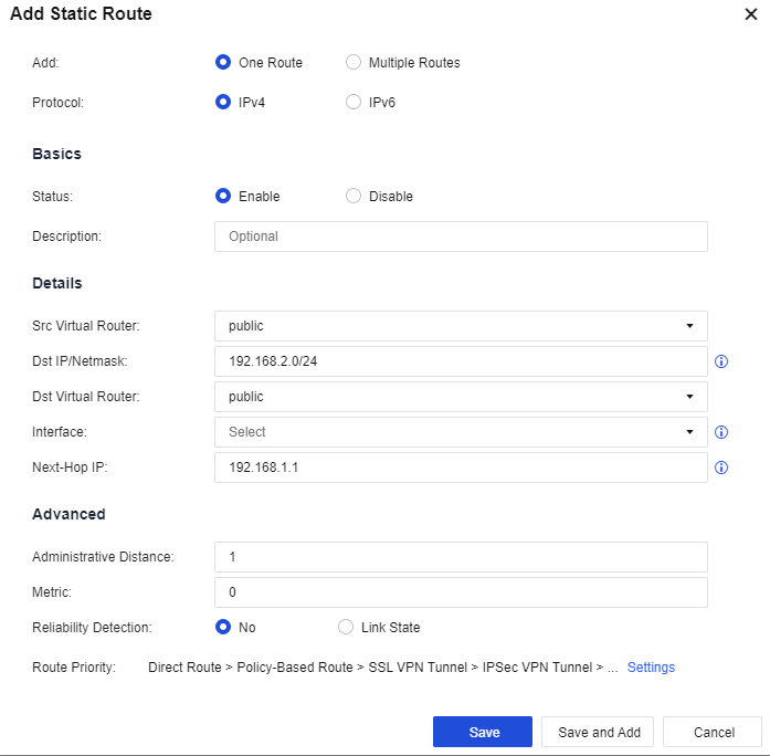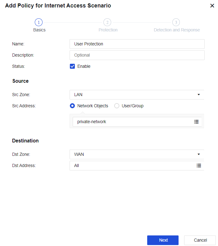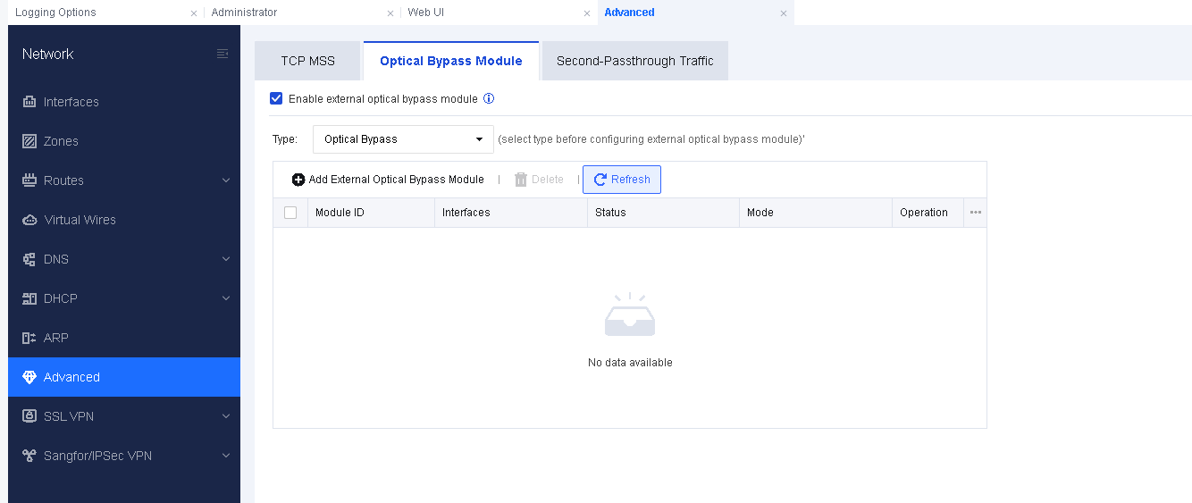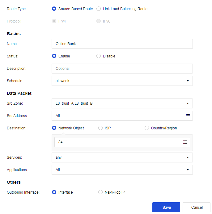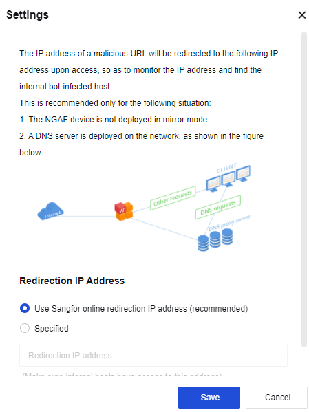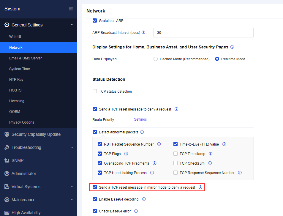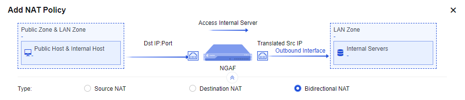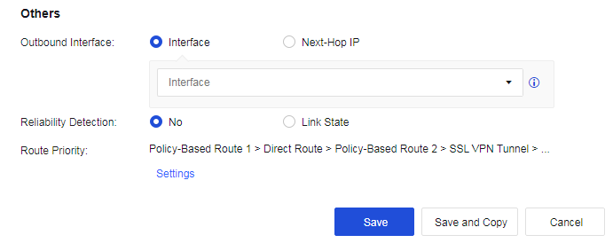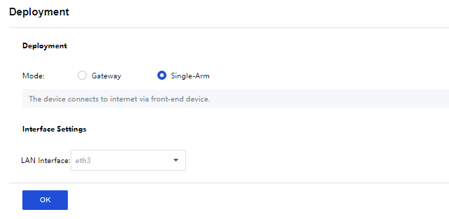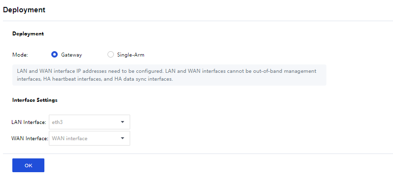 The deployment mode refers to the operating mode set for the device. You can set the device to the routing mode, transparent mode, Virtual Wire mode, bypass mode, and blend mode. An appropriate deployment mode is the precondition for successfully connecting the device to the network and making it work.