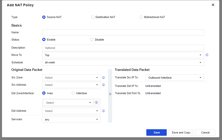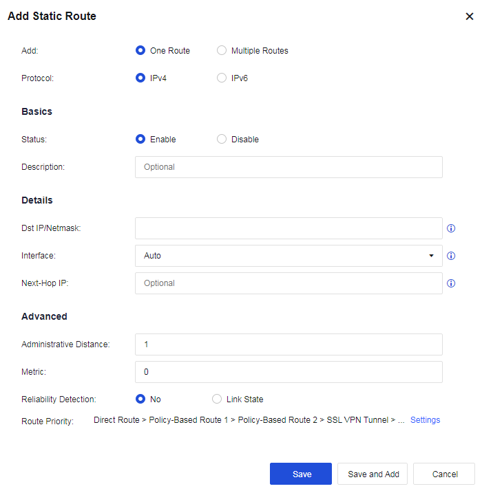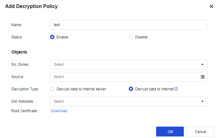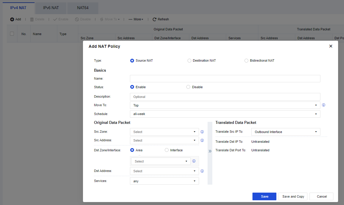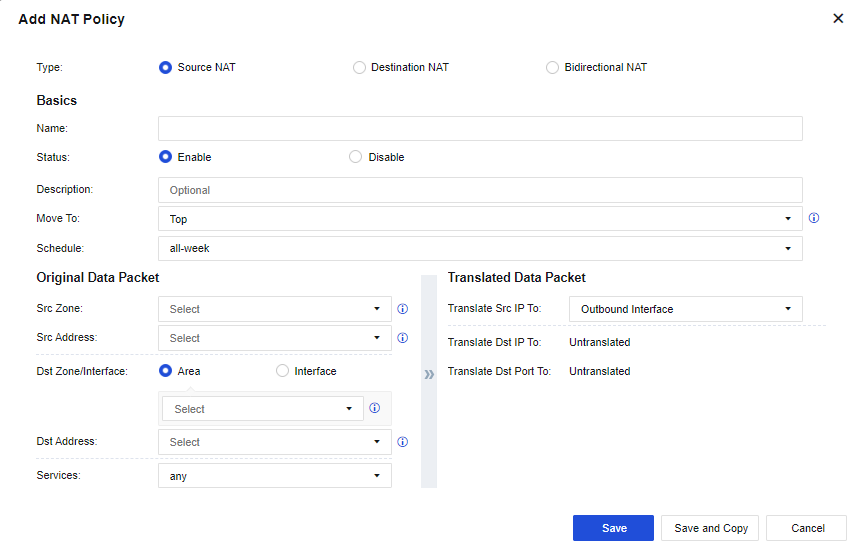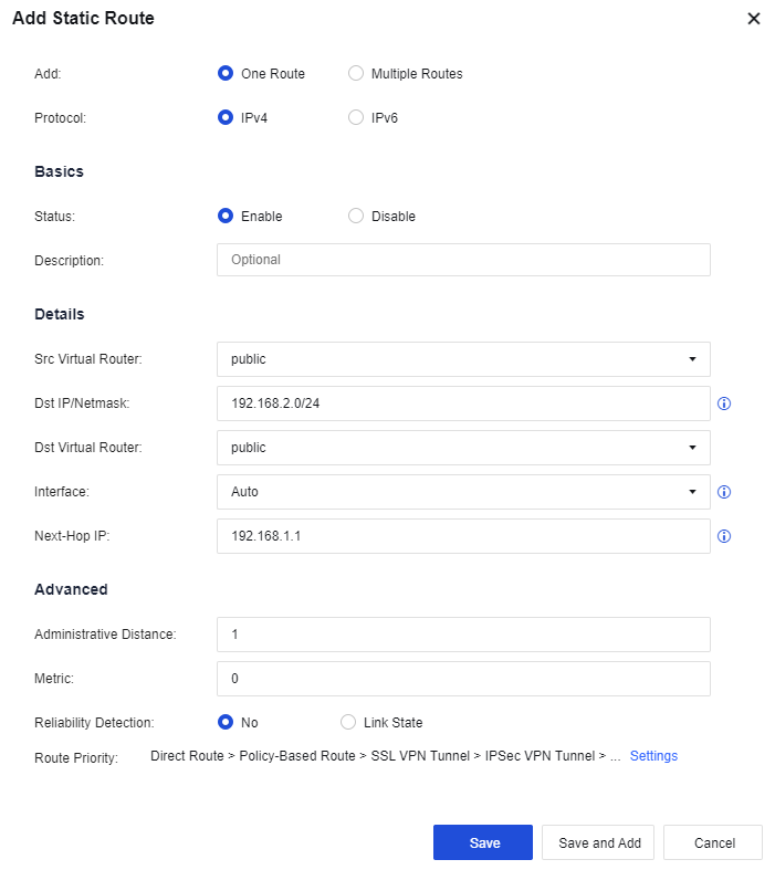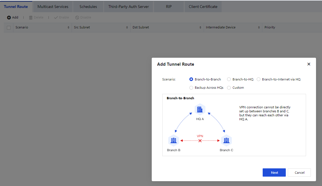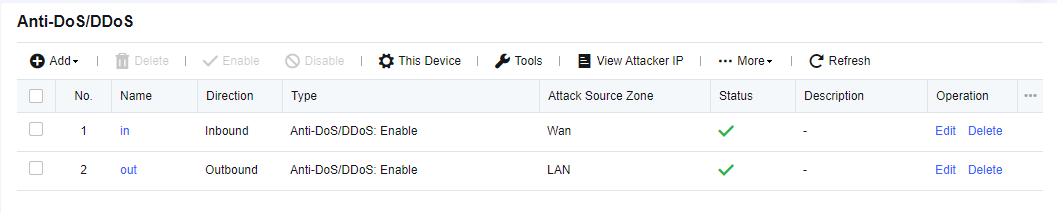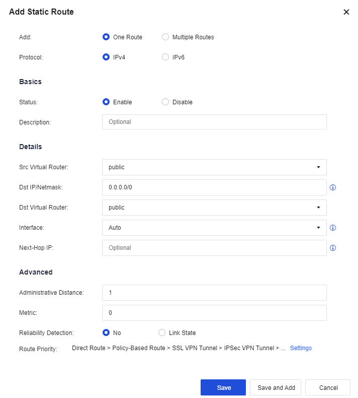 The deployment mode refers to the operating mode set for the device. You can set the device to the routing mode, transparent mode, Virtual Wire mode, bypass mode, and blend mode. An appropriate deployment mode is the precondition for successfully connecting the device to the network and making it work.