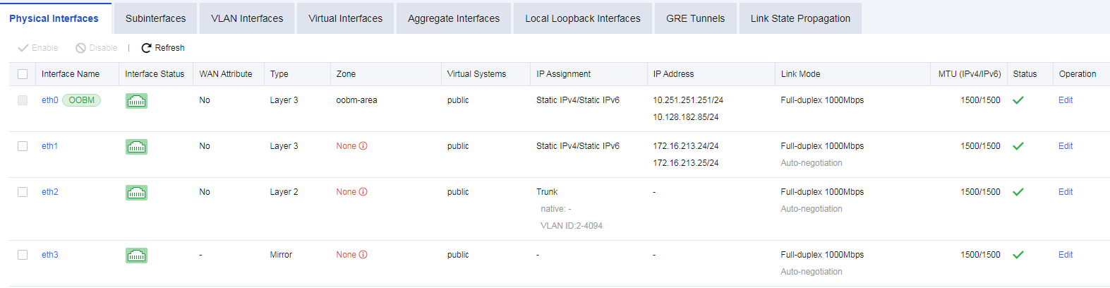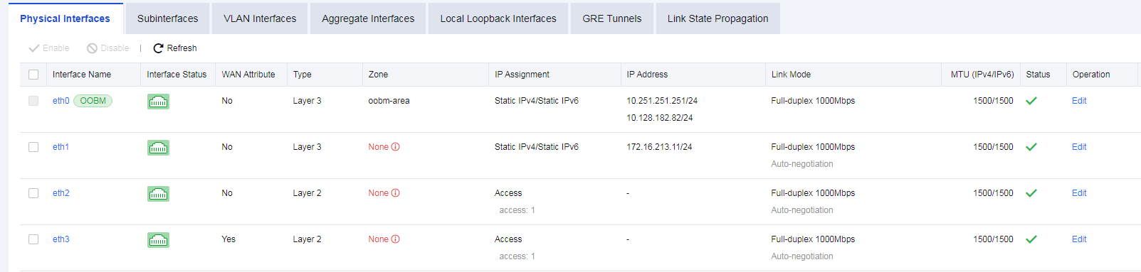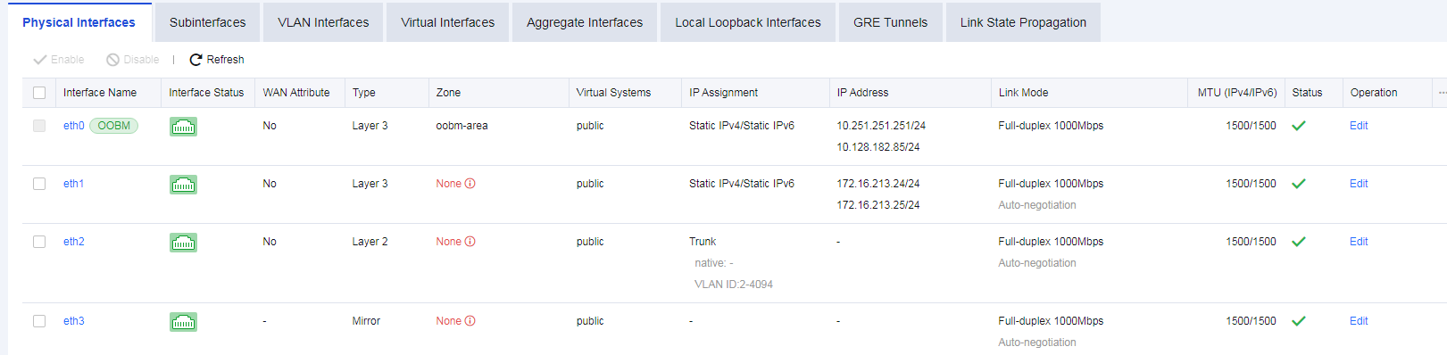 | Mix mode | It mainly refers to layer 2 and layer 3 interfaces on the device, especially when the IP address of the Internet must be configured for DMZ’s server cluster. |