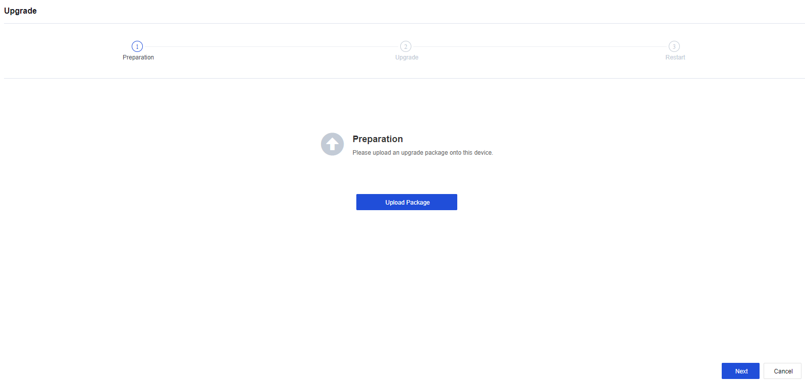 - Click the Upload Package button to upload the upgrade package from the local PC.