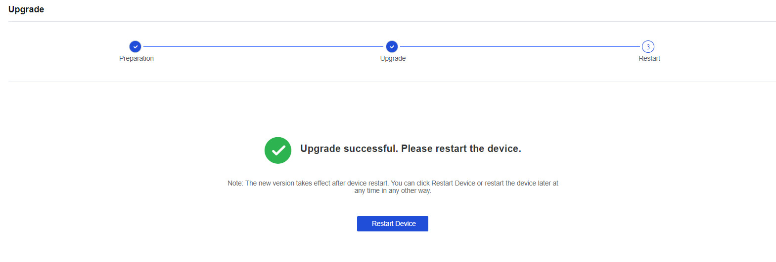 - After the upgrade package is uploaded, click Next to complete the configuration backup to start the upgrade. After the upgrade is completed, the device will reboot automatically. After the reboot is completed, log in to the device console and check the status of the device.