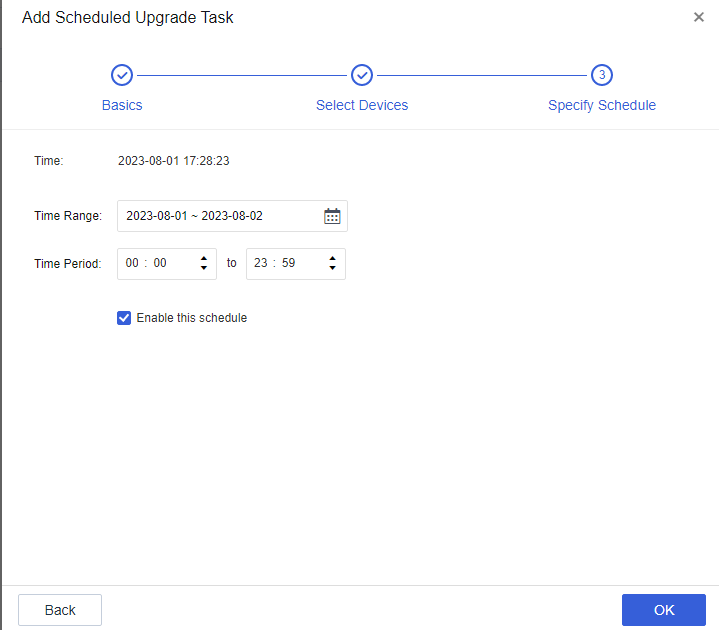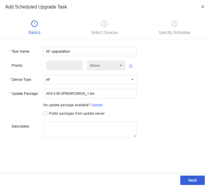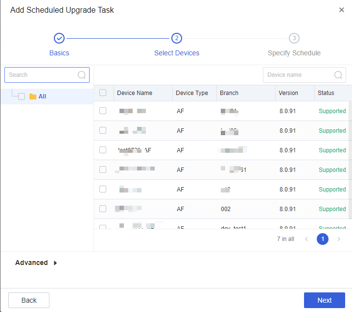 - Click Next and select devices to be upgraded and define the bulk upgrade scope.