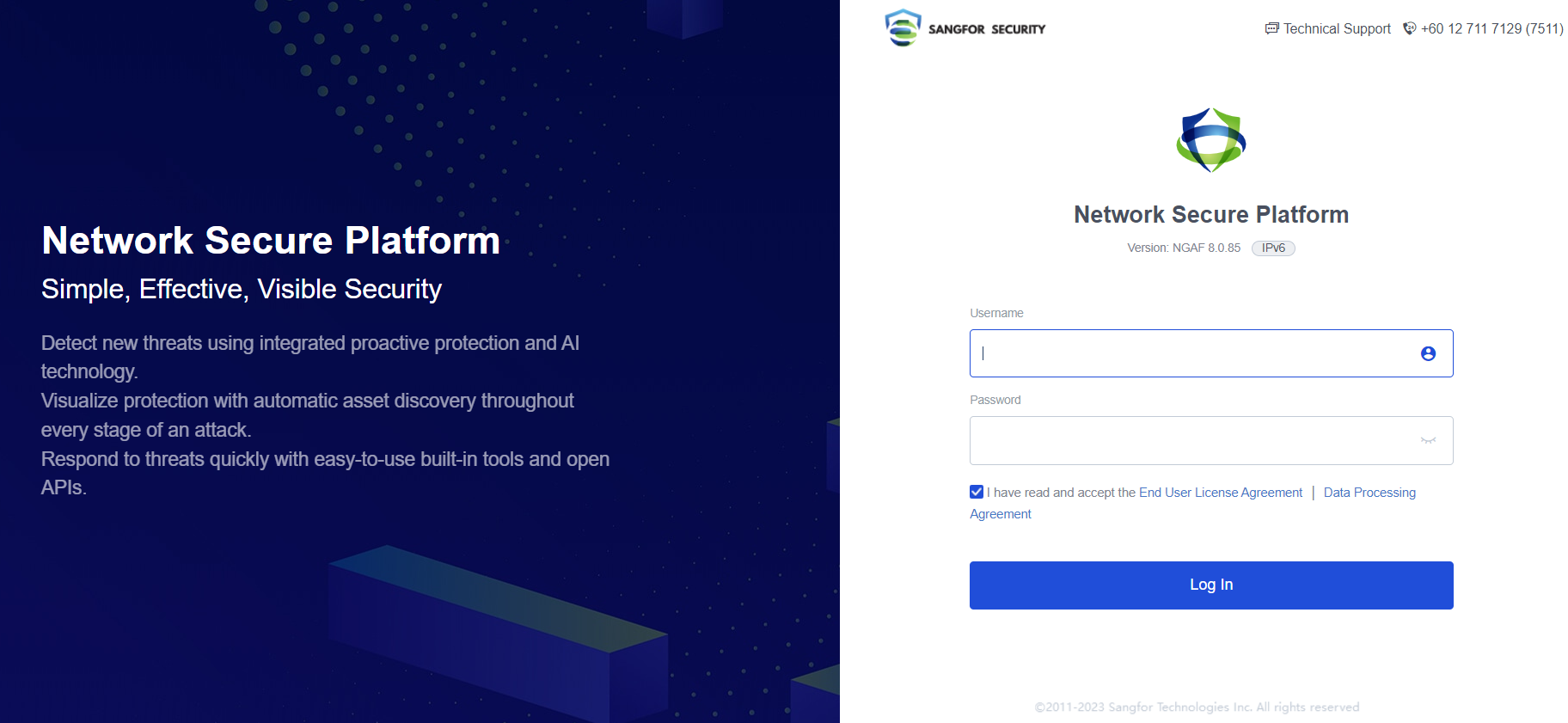 - Enter the username and password in the login box, which are both "admin" by default. Read the User Agreement and Privacy Policy (please contact Sangfor if you have any questions about the agreement). Check I have read and accept the End User Agreement, and then click Log In to log in to the Network Secure device to complete the configuration.