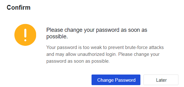 - If the password is too simple, it will be detected as a weak password, and the console will give a warning. If the password is deemed too weak after login, the following prompt window will appear.