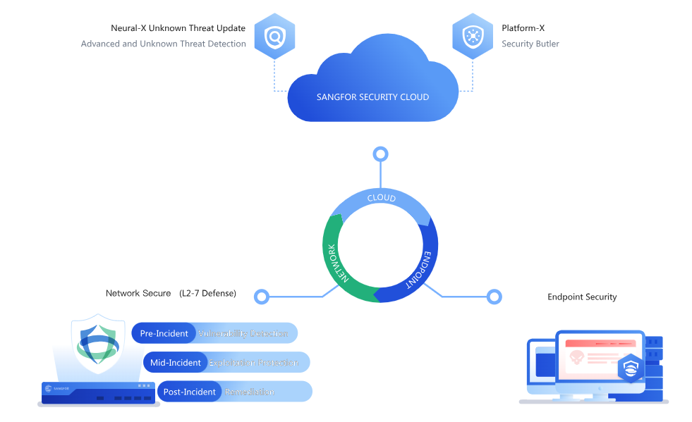 Sangfor Network Secure has the capabilities of risk prediction, deep security protection, and detection response, forming an integrated security system with whole-process protection and visibility.