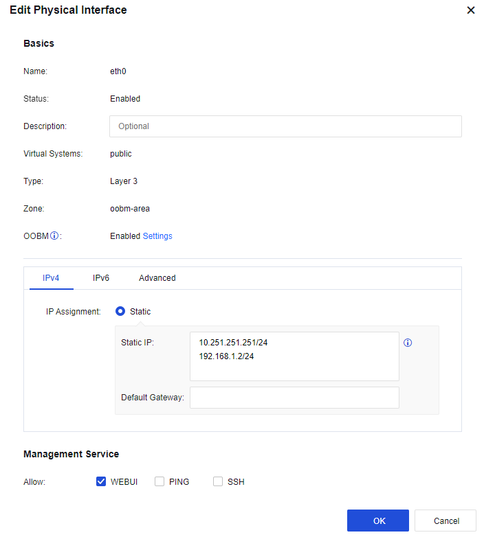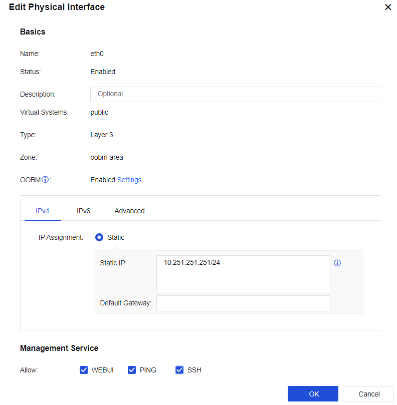 Log in to the device through the default IP address of the management interface (ETH0). The default IP address of the management interface is 10.251.251.251/24. You need to configure an IP address in the same network segment on the computer and log in to the device via .