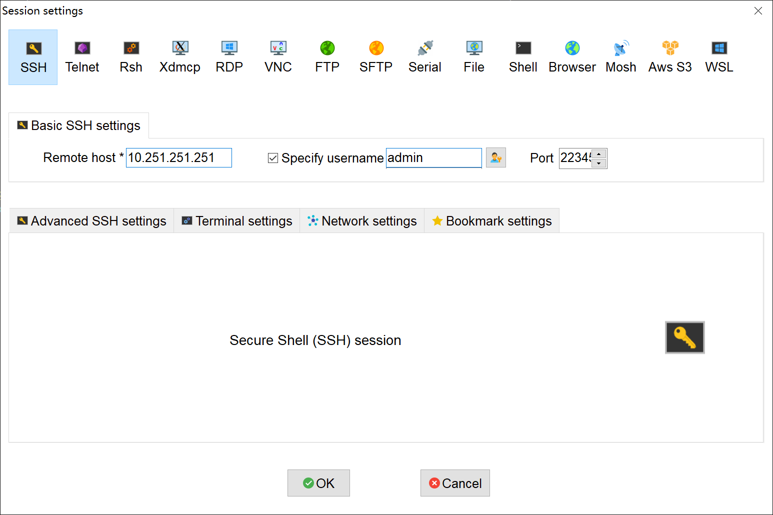 - Open the SSH management tool, set the port to 22345, and enter the administrator username and password to log in.