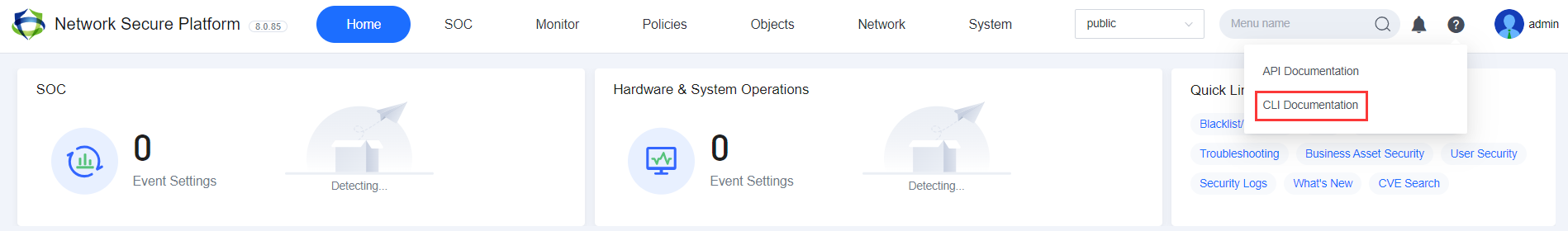 This manual does not describe the specific command parameters supported in the command line management mode. For more information, view the CLI Documentation, as shown below.
