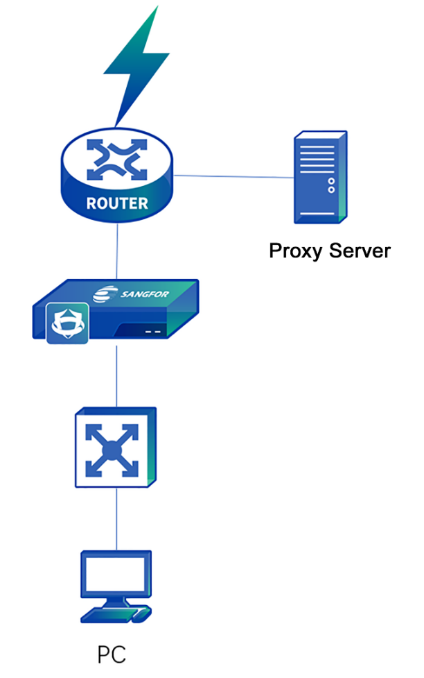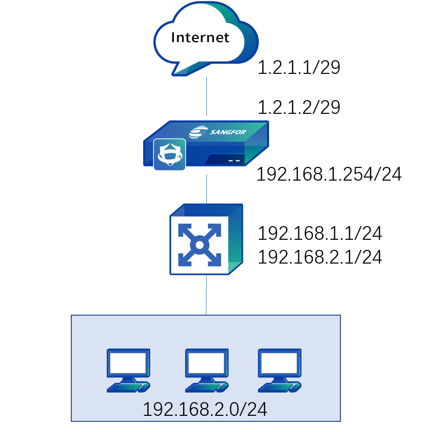An enterprise network is a layer 3 environment. It is planned to deploy the Network Secure device at the Internet port as a proxy of the LAN. The Internet line is connected to the fixed IP address via optical fiber, as shown below: