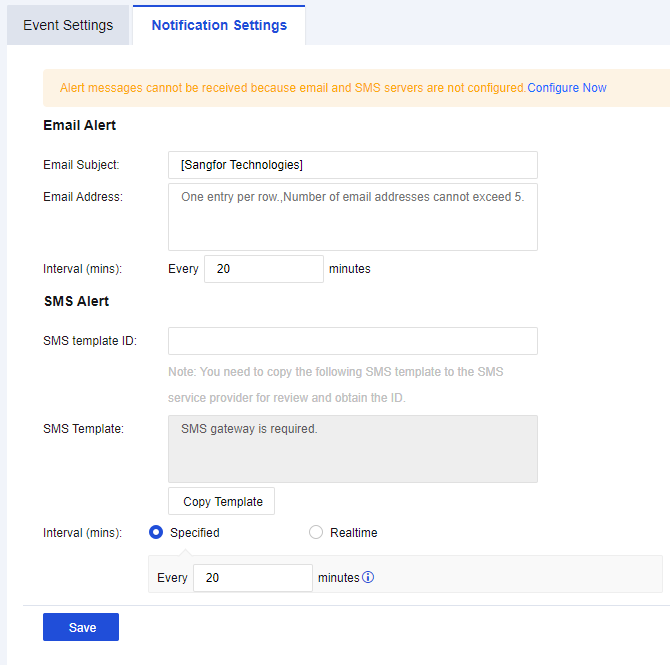 If the red alarm indicator remains on, please contact Sangfor Technical Support to determine whether the device is damaged. After the normal startup, the indicator may blink red sometimes. It is normal as the device is generating a system log.