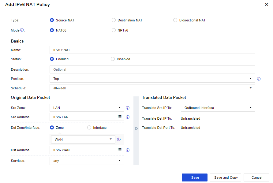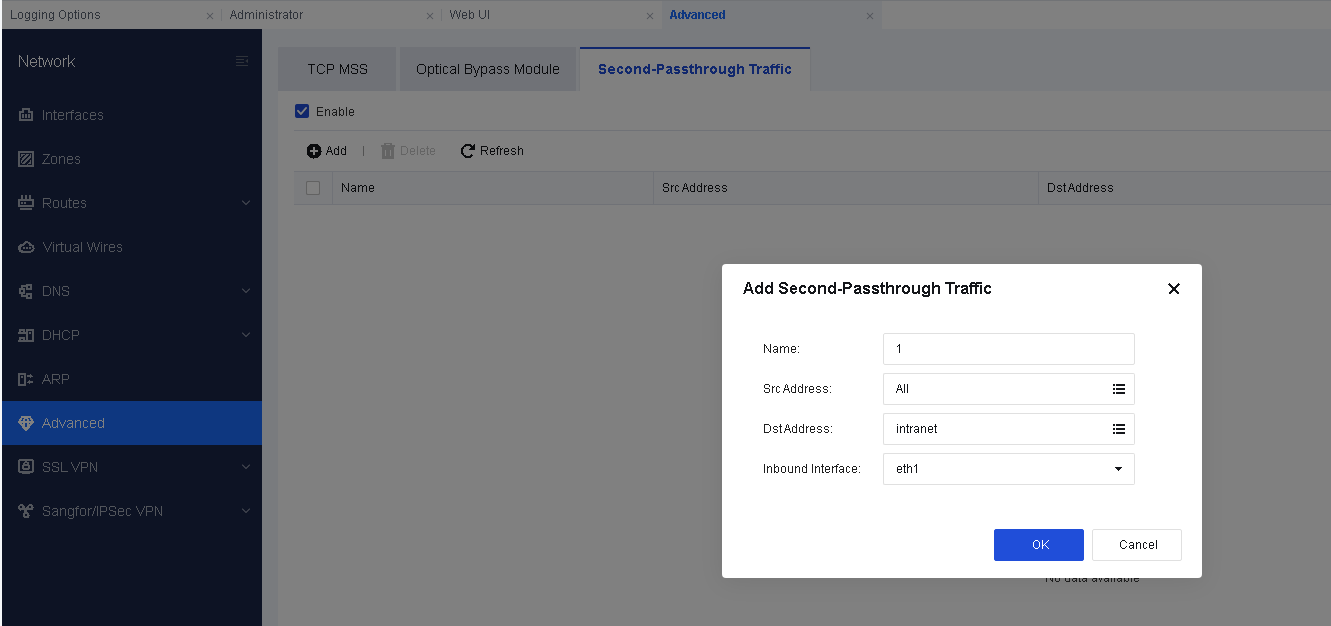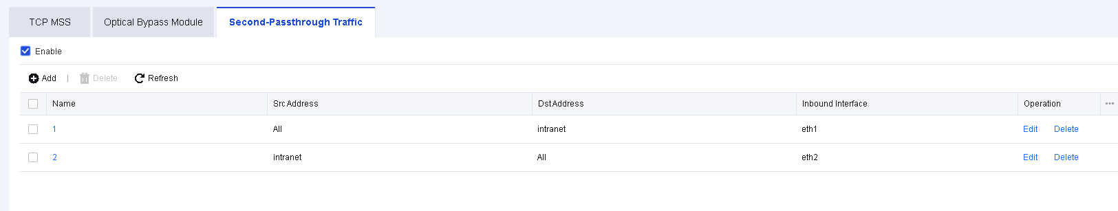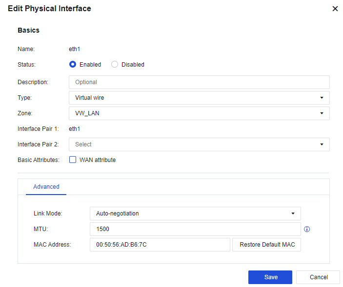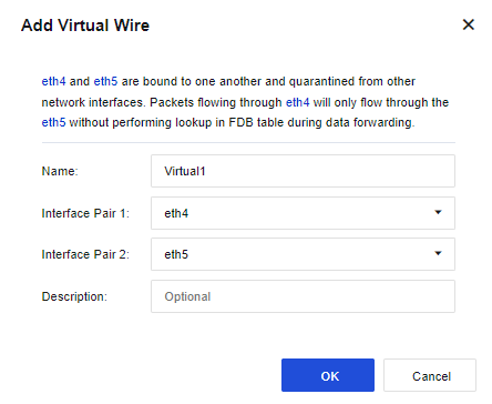 | Virtual wire mode | This is another special type of transparent deployment, which does not need to check the MAC table and directly forwards it from the interface paired with the virtual network cable. The forwarding efficiency of the Virtual Wire is higher than that of the transparent mode. |