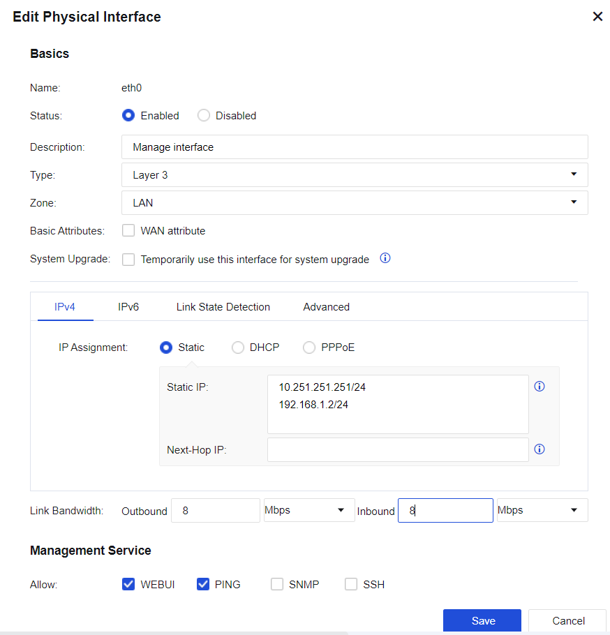If the computer is connected to the eth0 port of the device, you need to configure a 10.251.251.0/24 network segment address on the computer first, open the browser, and enter https://10.251.251.251 to log in to the device gateway console.