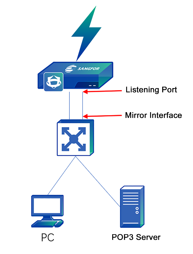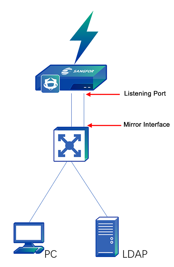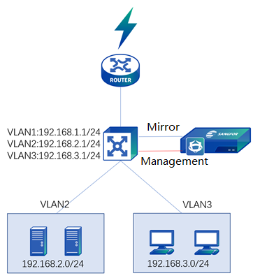 | Mirror mode | The device is connected to the mirror interface or HUB of the LAN switch, mirroring the data of LAN users and detecting the traffic through the mirrored data. There is no need to change the user’s network environment at all, and it can avoid the risk of interrupting the user’s network by the device. However, in this mode, the device only detects traffic and cannot block malicious traffic. |