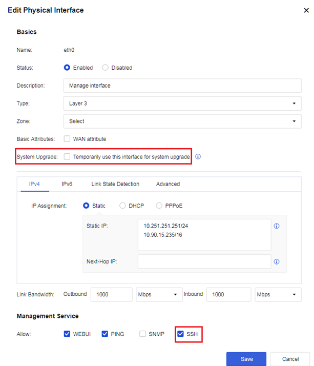 - Log in to the NGAF device, and navigate to Network > Interfaces > Physical Interfaces. Then, on the editing page of the interface used for connecting the Firmware Updater, tick Temporarily use this interface for system upgrade for System Upgrade.