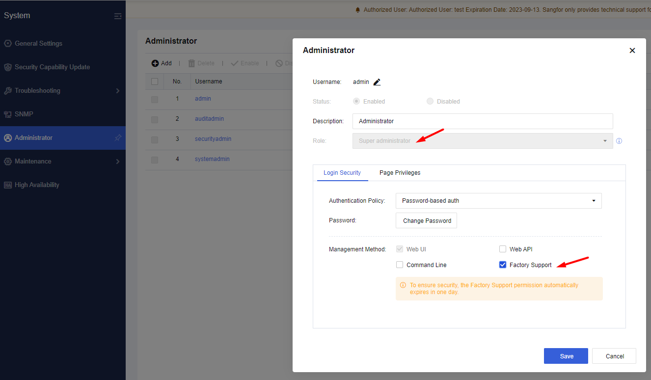 - Navigate to System > Administrator, click the Super Administrator, and tick Factory Support under Management Method.