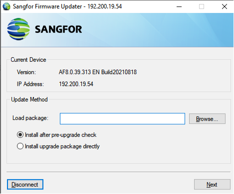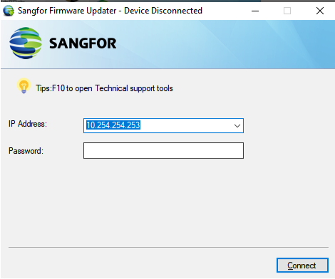 Run the Sangfor Firmware Updater, enter the IP address and admin password of the NGAF device, and then click Connect.