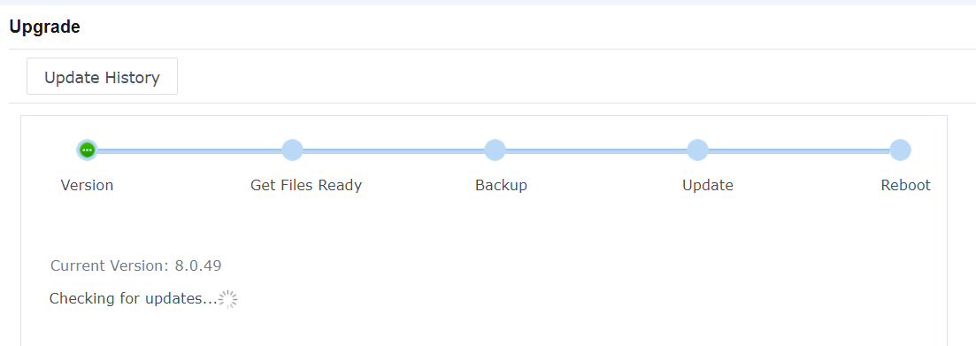 Check whether the current version is NGAF 8.0.26 and above. Only NGAF 8.0.26, NGAF 8.0.35, NGAF 8.0.36, NGAF 8.0.39, and NGAF 8.0.47 can directly upgrade to NGAF 8.0.49. Versions earlier than NGAF 8.0.26 should be upgraded to NGAF 8.0.26 first and then to NGAF 8.0.49.