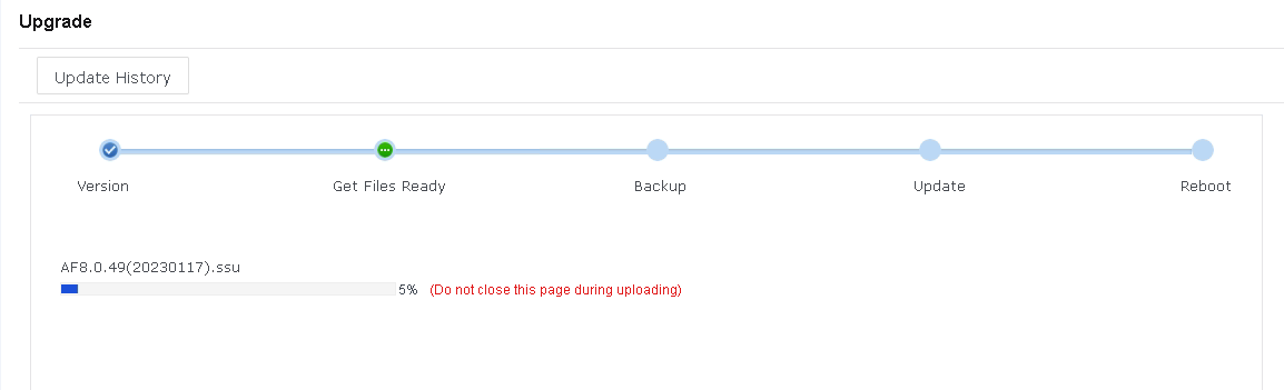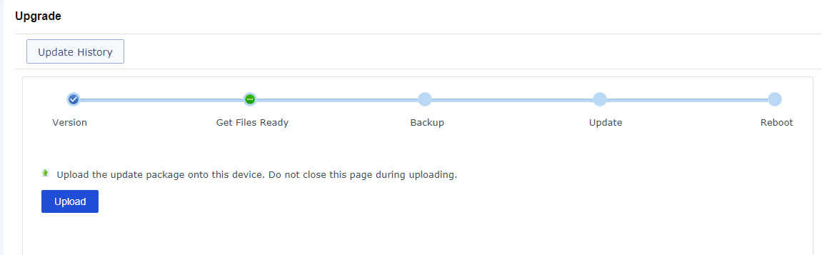 Do not close the uploading page while uploading the update package. Otherwise, you have to enter the page again and repeat the preceding steps.