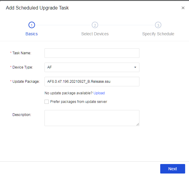 Click Next to start an upgrade. Device configurations will back up automatically. After the upgrade is successful, a message will appear, and the device will restart automatically.
