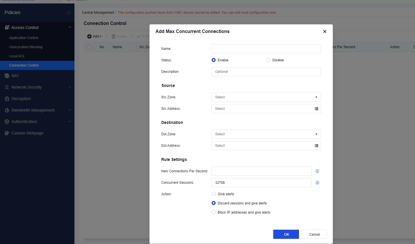 Actions are provided for administrators to limit the number of new connections from a single IP address. It ensures the stable operation of Network Secure. If the number of new connections exceeds the specified threshold, actions such as giving alerts, discarding sessions, and blocking IP addresses can be executed.
