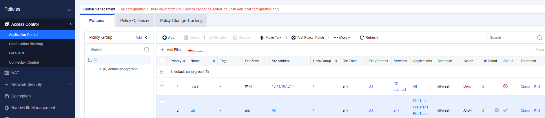 Application control and NAT policies can be filtered flexibly based on fields such as source address, source zone, service, port, and last match count.