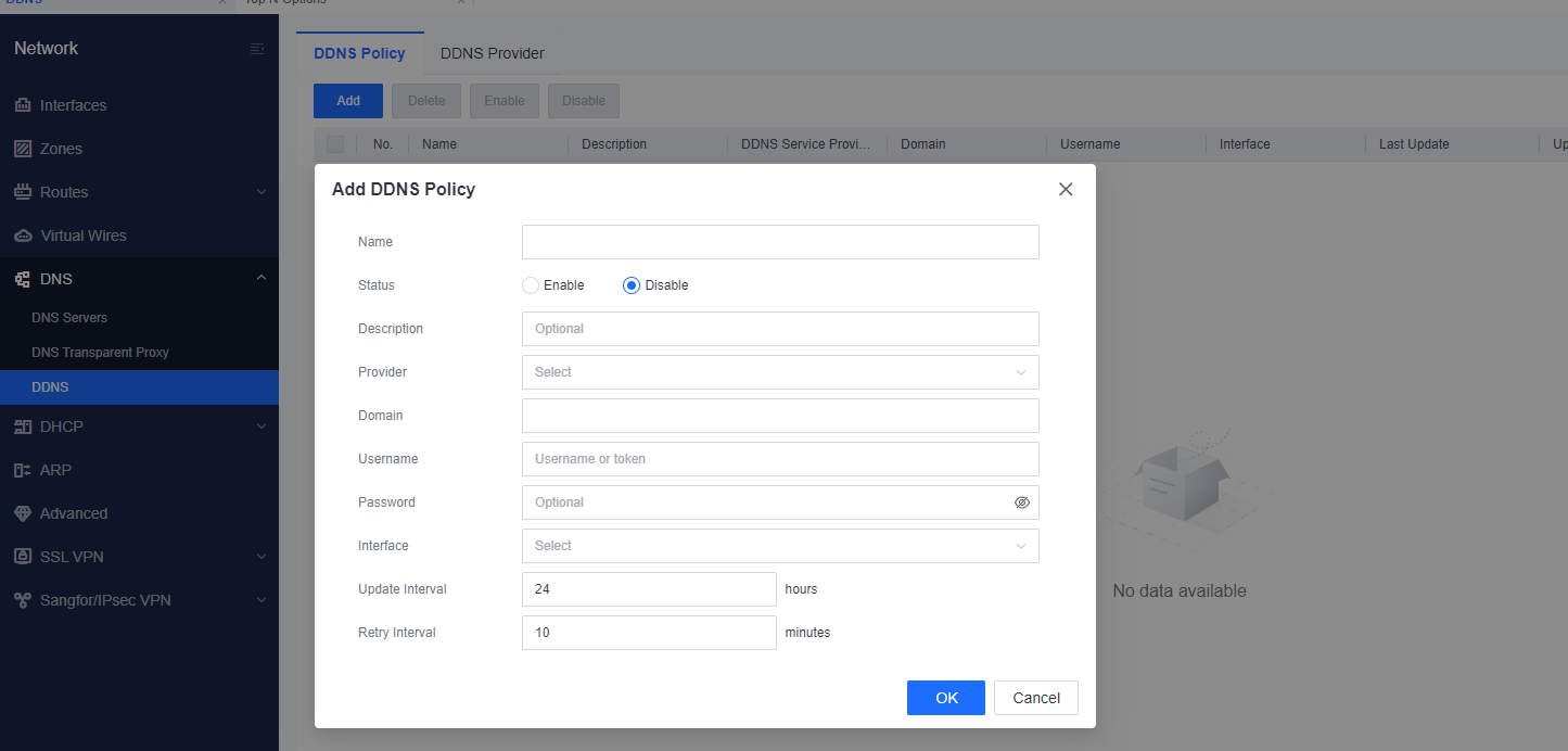 DDNS policies can be configured to automatically map a user’s dynamic IP address to a permanent domain name. Users do not need to update the mapping between IP addresses and domain names manually.