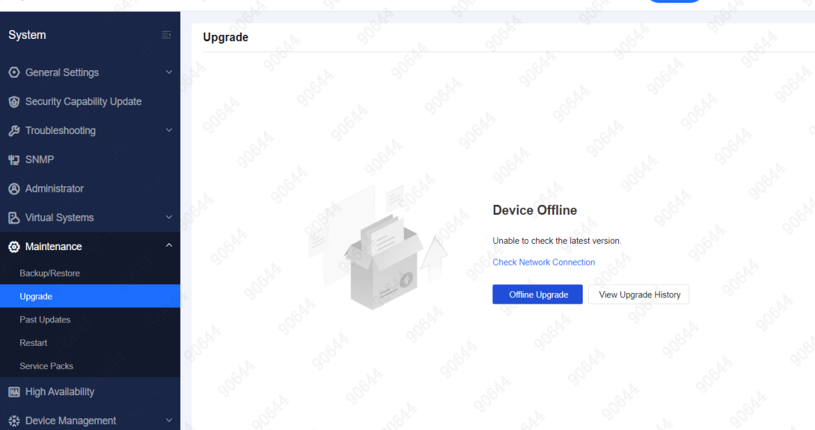 Offline Update: Go to System > Maintenance > Upgrade, and click Offline Update. In the Get Files Ready step, click Upload to upload the update package. Then, complete the upgrade by following the instructions.