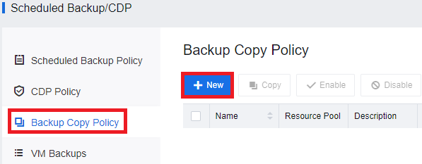 - Go to Menu Under Resources > Scheduled Backup/CDP > Backup Copy Policy > New to create the Backup Copy policy.
