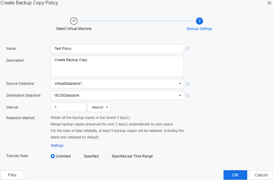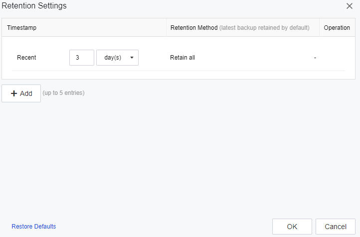 - You can manually set the backup retention mode, click the Settings button, and support setting the backup replication cycle by day, week, month, and year. You can click the Add button to set maximum 5-time plan. If multiple time plans are added, the last backup within the time plan will be retained by default.