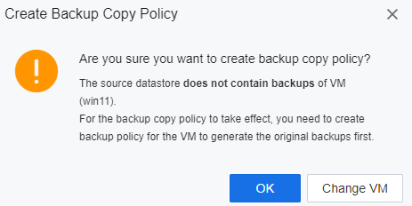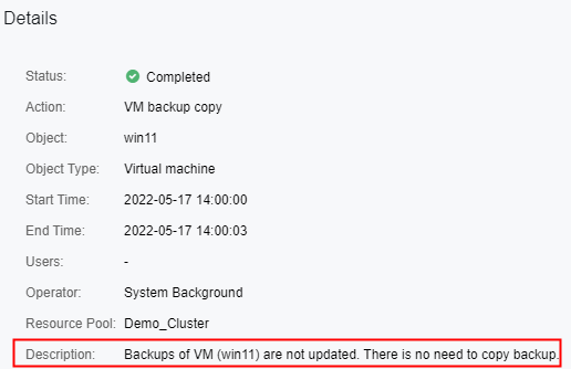 - If SCP detects this VM doesn’t have any backup, it will not copy the backup to the destination datastore, but the policy will still trigger and show Backups of VM (win11) are not updated. There is no need to copy backup, as shown below.