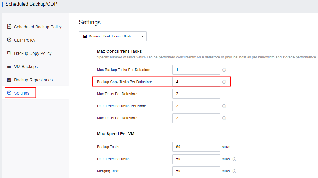- You also can configure the maximum concurrent Backup Copy Task Per Datastore.