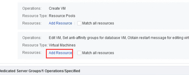 3. In the Edit VM page Click Add Resources, select the virtual machines you want to allocate, andthen click ok. 4. Associate permissions with the user "admA." |