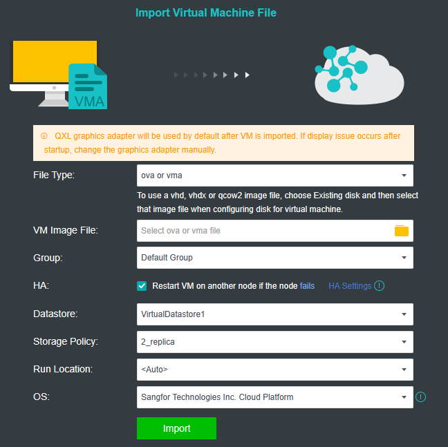 Step 3. File type select ova or vma. Select the downloaded SCP vma Image File, and then select the Group, Datastore, Storage Policy and Run Locaion, The OS should select Sangfor Technologies Inc. Cloud Platform. After that, click Import to display the upload interface.