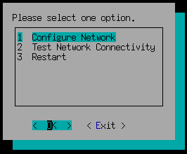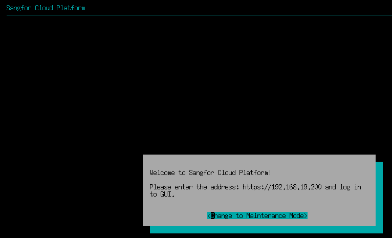 Have a random click on the virtual machine’s console, press Enter to enter into the maintenance mode, and then enter the password (the initial password is admin). After the password is entered, click OK and press Enter to enter the configuration interface.
