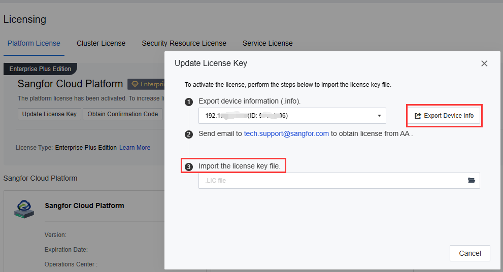 Click Export Device Info the Export the device info file. Use the device info file get the license file (In the testing environment, and you can log in to the test license system to activate it yourself. If it is the sales environment, you need to send the files to the Related personnel) Import the license file after getting the license file in the same page.