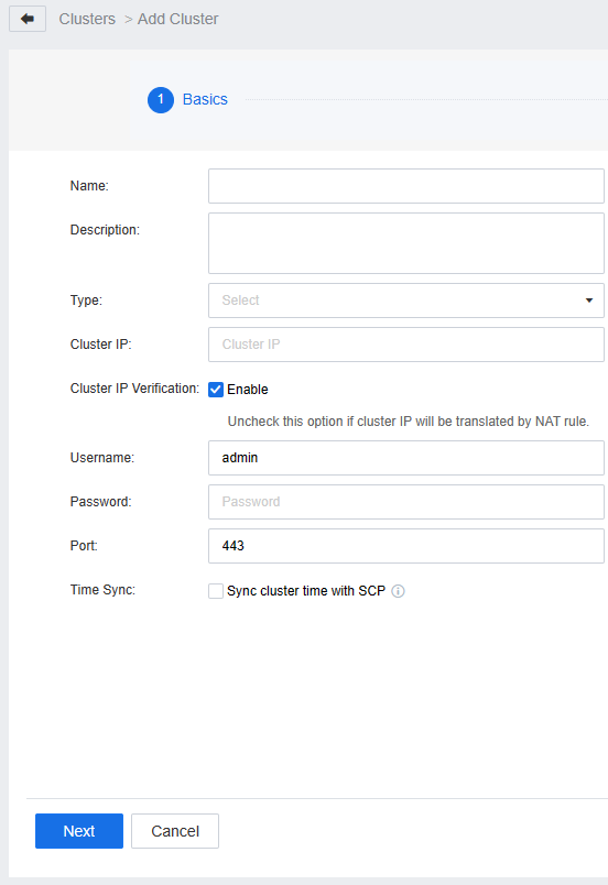 Fill in the cluster Name and Description, and after selecting the cluster Type, enter the Cluster IP and admin Password. If the port has not been changed, keep the default setting (if the cluster IP has been mapped by NAT, please uncheck Cluster IP verification), select the appropriate licensing mode, and click the Next .