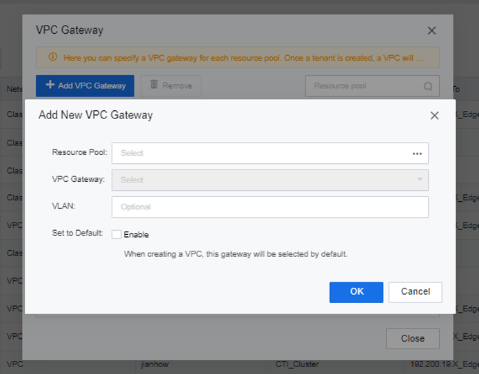 Select Networking > Network Deployment and click VPC Gateway. select the VPC outgoing interface corresponding to each resource pool.
