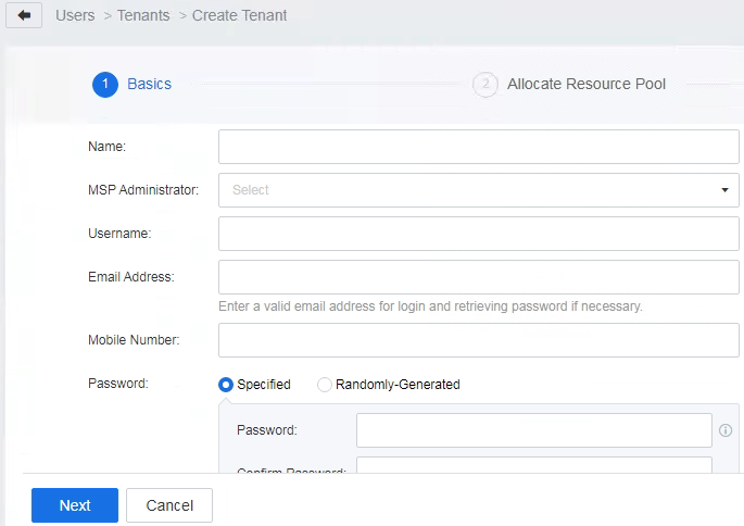 Select User and Access Management > User > Tenants. Then, click the New button to create a tenant . Enter the tenant’s name, login username, email address, mobile phone number, and password, and click Next .