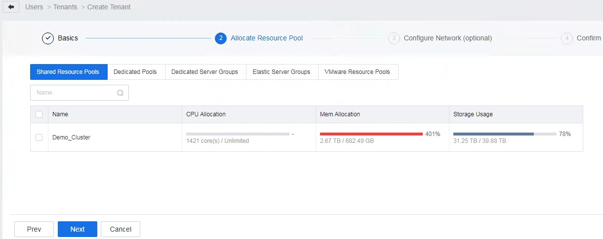 Shared mode: Shared resource pool can be assigned to multiple tenants.