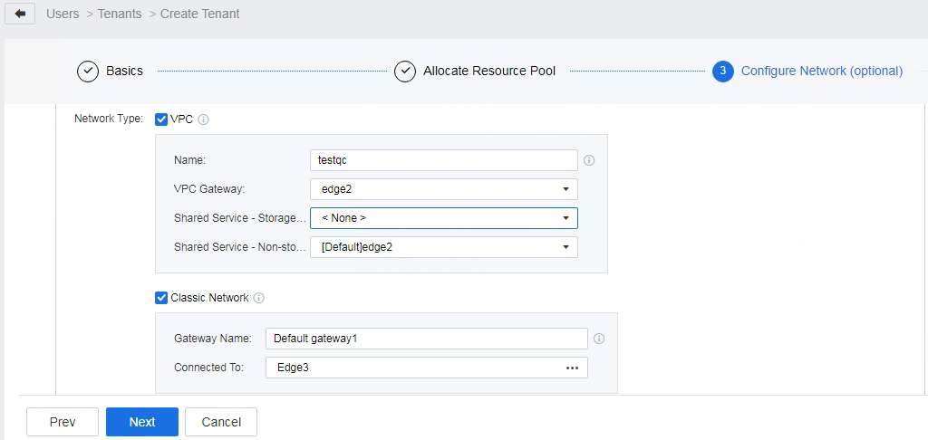 Configure the network type of the tenant. VPC is selected by default. You can select the Classic network if you want to, fill in the Gateway Name, and select the Connected To device.