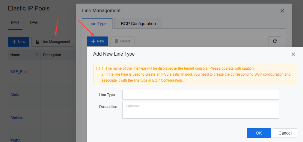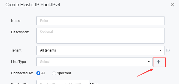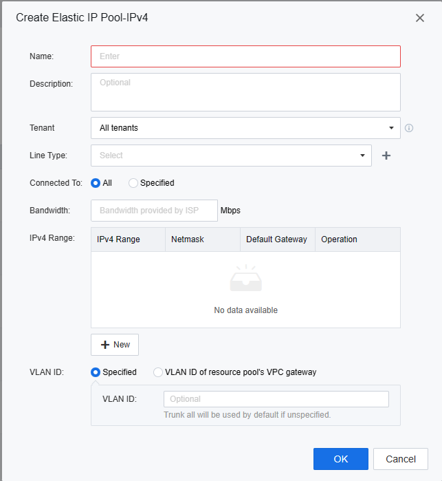 Select Networking > IP and Bandwidth > Shared Services > Elastic IP Pools, and click New. Fill in the name and description of the elastic IP pool, select the tenant to be associated, line type, network egress, set the total bandwidth, add the elastic IP, and click OK to complete the creation.