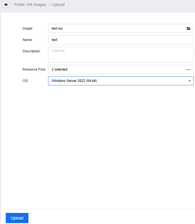 Select public VM image > upload select the iso or vma file resource pool and OS type fill in the name description click upload wait the file complete upload .